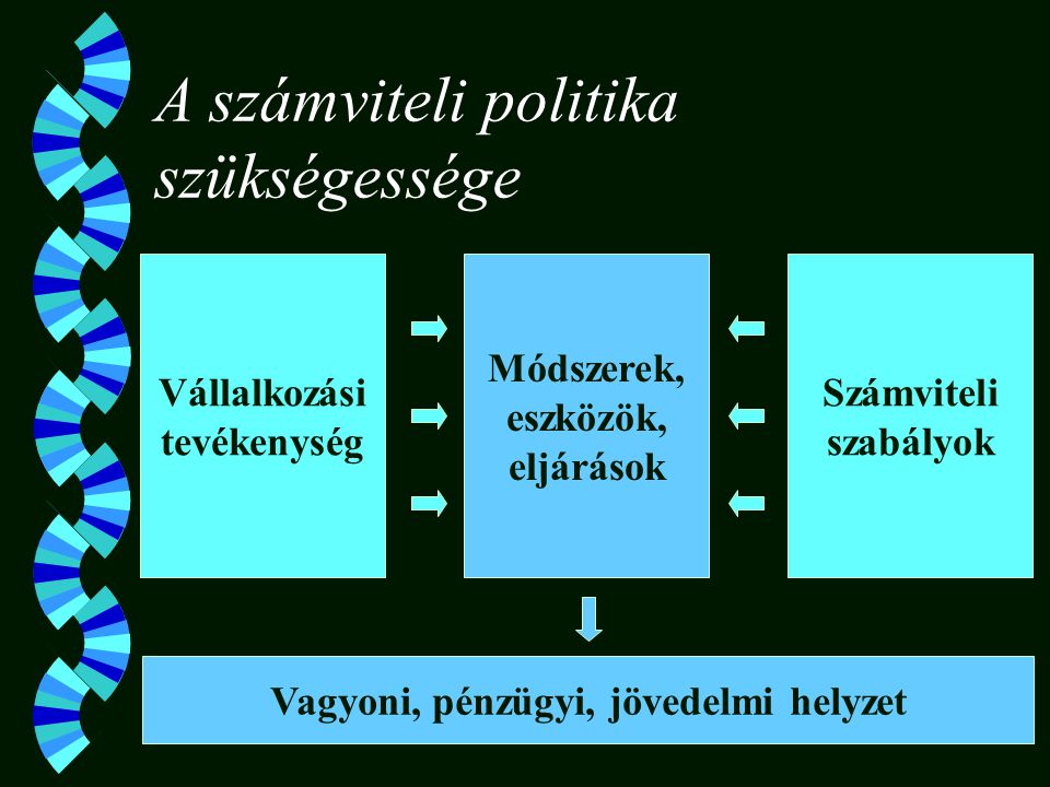 A 2000. évi C. számviteli törvény 14. § (3) bekezdése szerint a törvényben rögzített alapelvek, értékelési előírások alapján ki kell alakítani és írásba kell foglalni a gazdálkodó adottságainak, körülményeinek leginkább megfelelő - a törvény végrehajtásának módszereit, eszközeit meghatározó számviteli politikát.